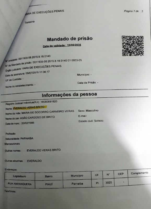 O mandado está assinado pelo juiz da Vara de Execuções Penais da Comarca de Teresina, Dr. José Vidal de Freitas Filho.